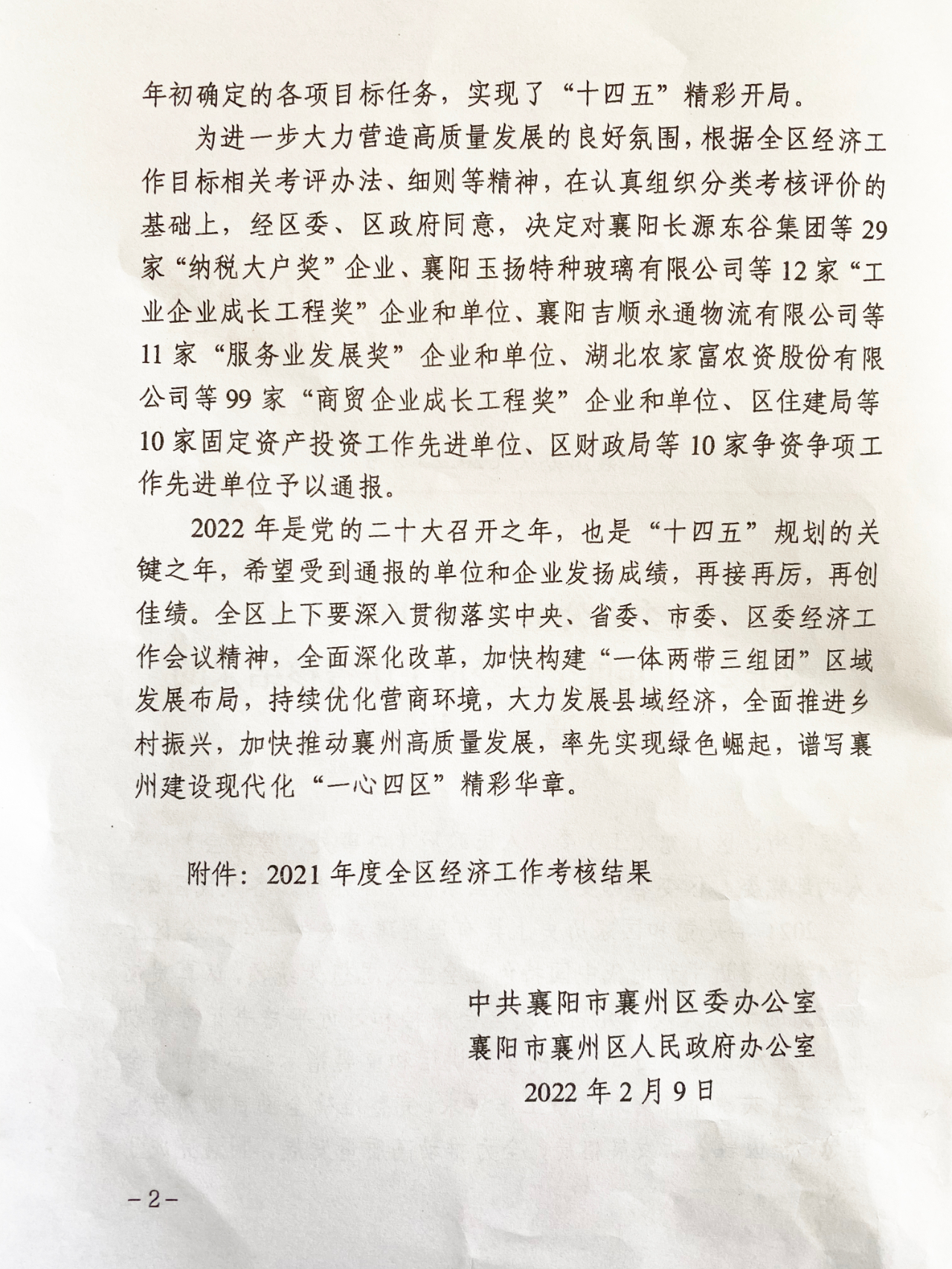 开工第一天,WG网页版重工收到了区政府发来的“大红包”。襄州区为进一步大力营造高质量发展的良好氛围,根据全区经济工作目标相关考评办法、细则等精神,对WG网页版等29家纳税500万元以上的企业进行了嘉奖。