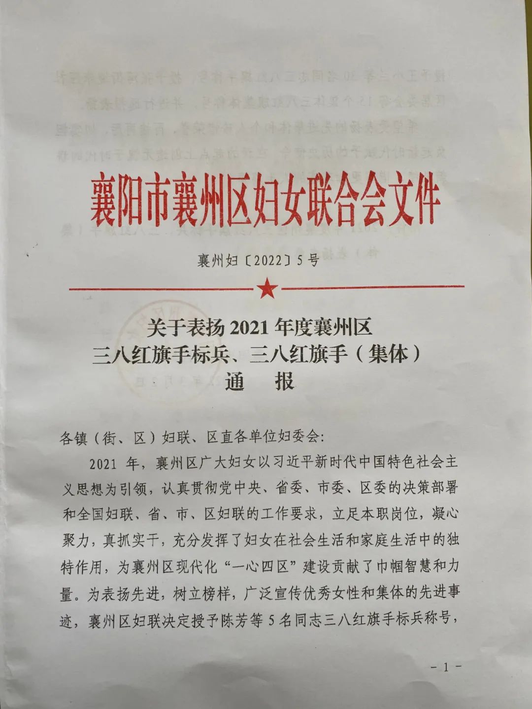 胡艳同志荣获襄州区“三八红旗手”荣誉称号